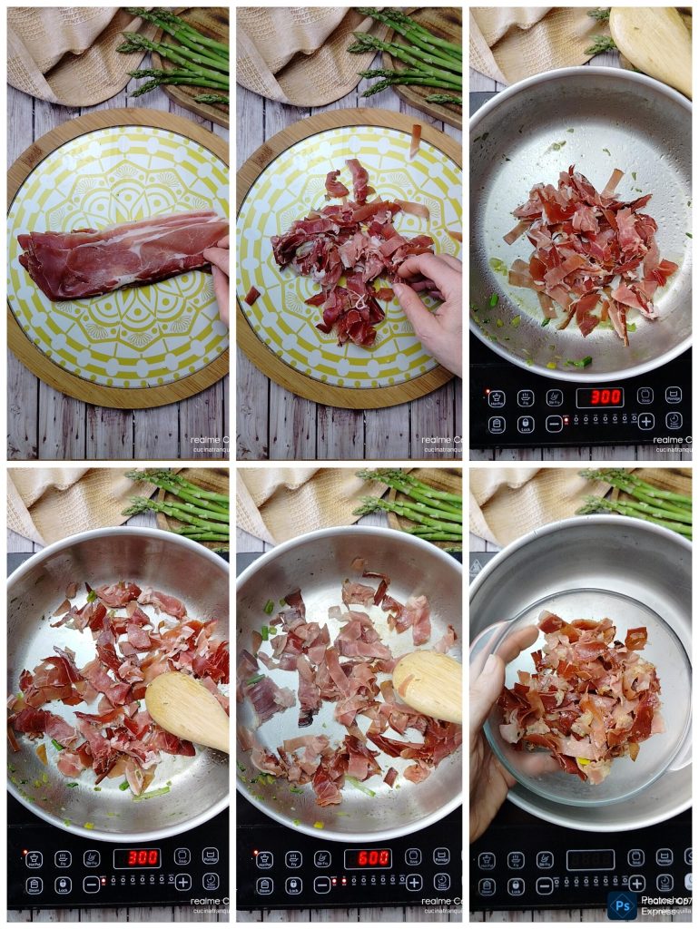 I then paired asparagus with speck, made crispy in the pan, without adding other fats or ingredients but you can replace it with prosciutto or pancetta, always in slices.