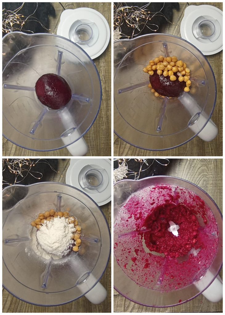 In a food processor, blend the beet dried with absorbent paper with the well-drained chickpeas and 1 cup of flour.