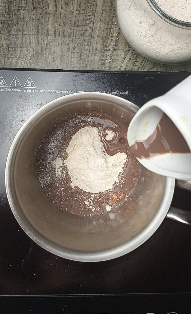 • To prepare the Hot Porridge with Soy Milk, Cocoa, and Oat Bran, first place the oat bran in a small pot.