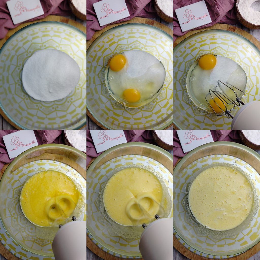 To make the Lactose-Free Cocoa Cake, first beat the eggs with the sugar for at least two minutes until you obtain a pale, frothy mixture.