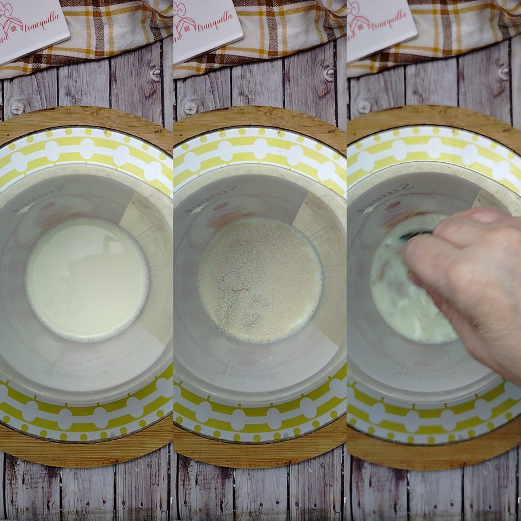 To make the lactose-free milk buns with seed mix ideal for buffets, first dissolve the yeast for long-rise savory preparations in the milk, warming it slightly and stirring with a fork or spoon.
