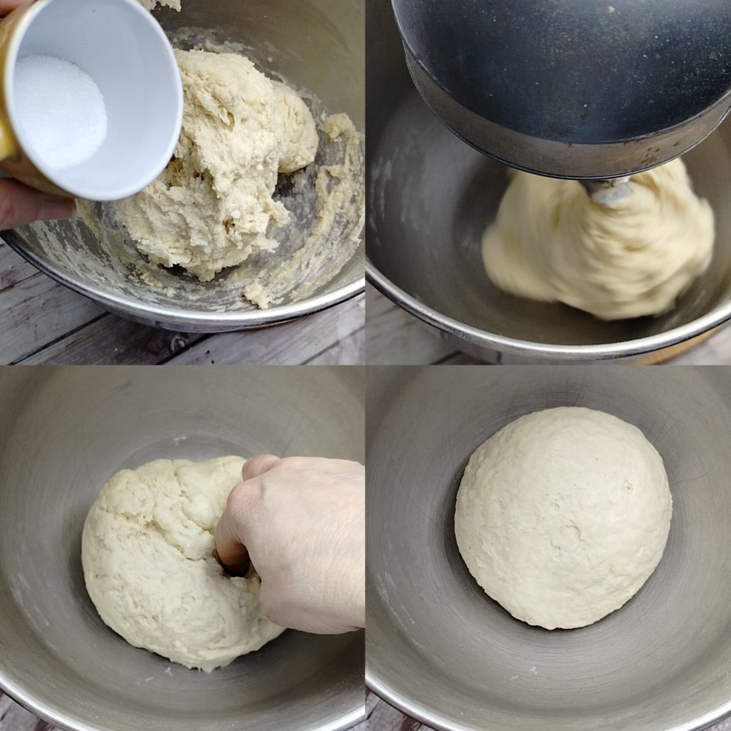 Add the salt and continue working the dough until it is smooth. Quickly work it in the bowl to form a smooth and even ball, cover it, and let it rise for two hours or until it doubles in size.