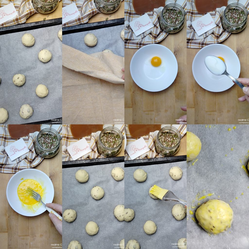 Repeat this operation until the ingredients are finished, placing the balls spaced on a baking sheet lined with parchment paper and cover them with a kitchen towel, letting them rise for another 30 minutes. Brush with the yolk and milk mixture.
