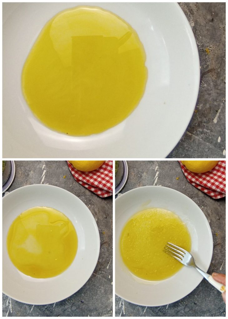 Squeeze the lemon juice, filtering it with a strainer if necessary to remove any seeds, and add it to the extra virgin olive oil.