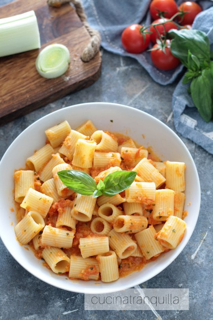 Mezze maniche with cherry tomato and leek cream, an easy and fragrant recipe thanks also to the presence of basil, which makes this dish even better.