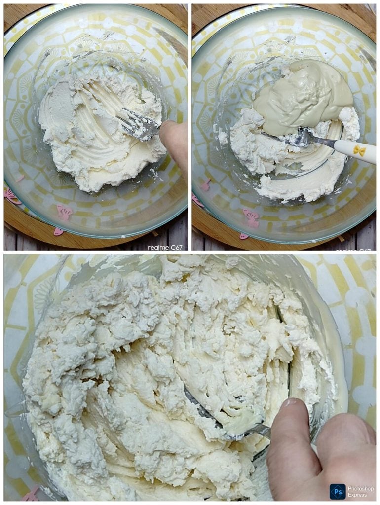 Add the melted white chocolate, mix well, and let it rest for 30 minutes in the refrigerator after covering the bowl with plastic wrap.