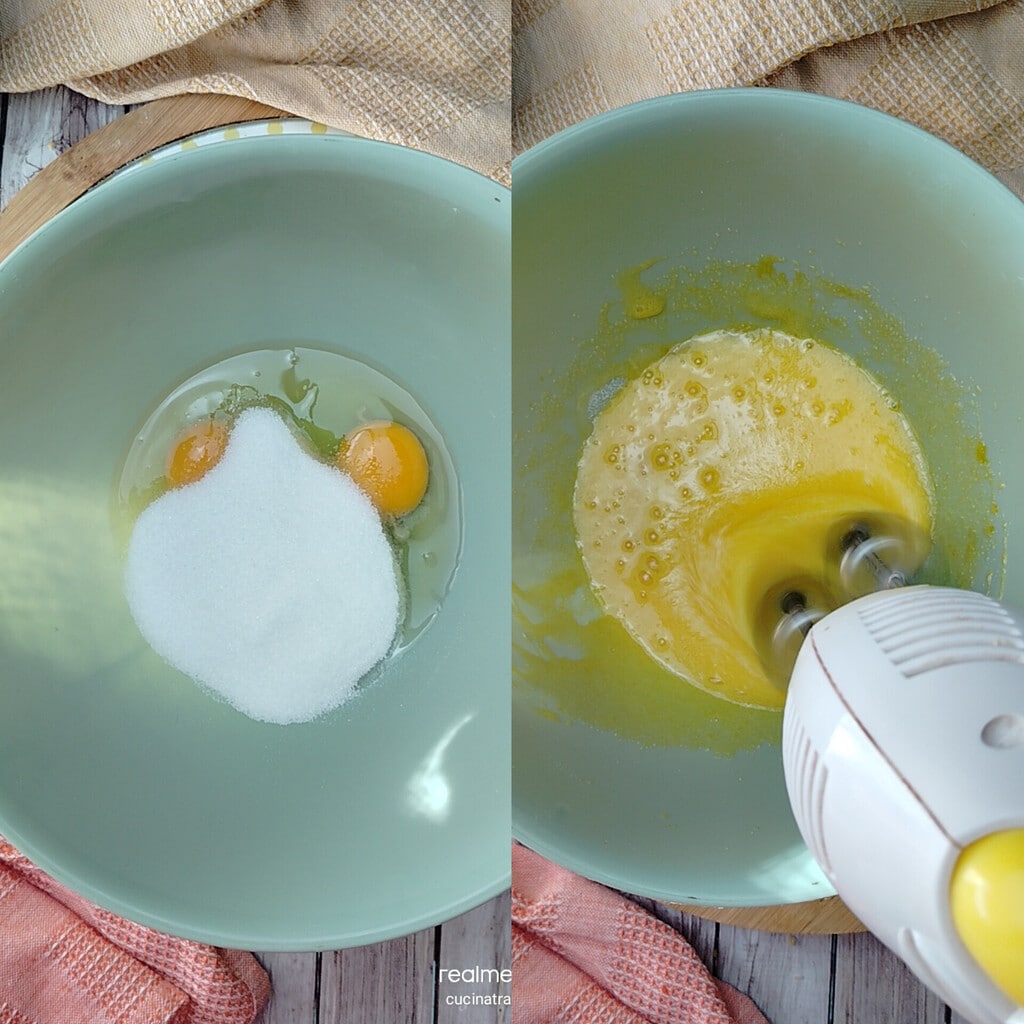 • To make the Mini Muffins with Chestnut Flour, first, in a large bowl, work the eggs with the sugar for a couple of minutes. The first mixture should be a bit more foamy and light.