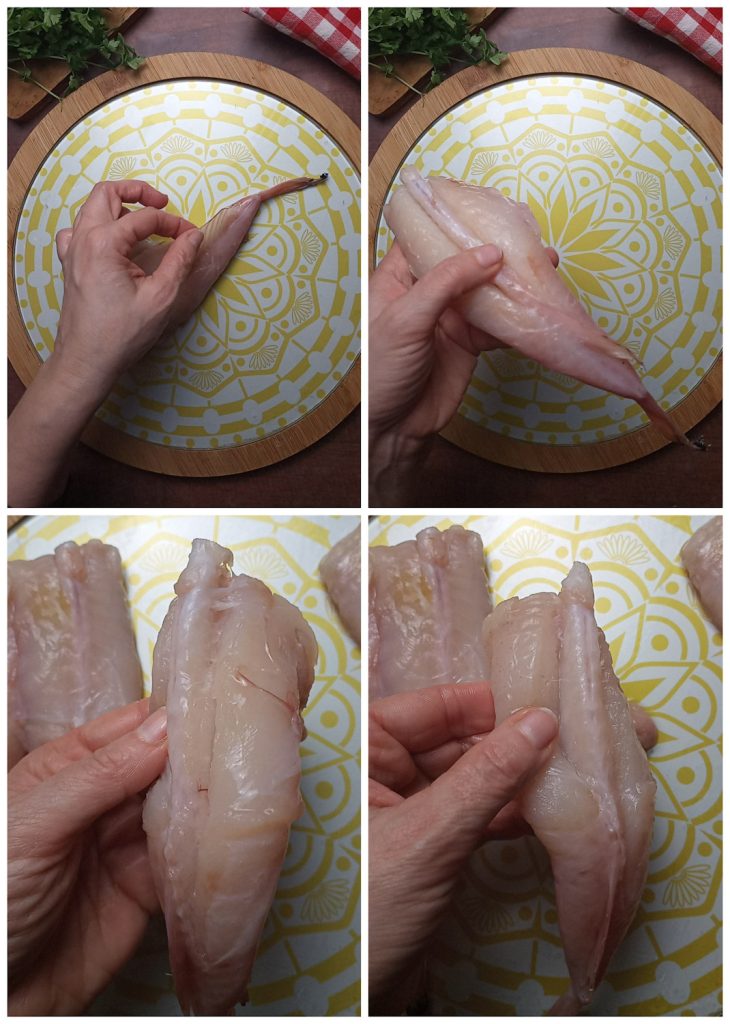 To prepare the Monkfish Mediterranean Style, first clean the monkfish tail by gently pulling the skin and then cutting off the tail and fins by pulling slightly.