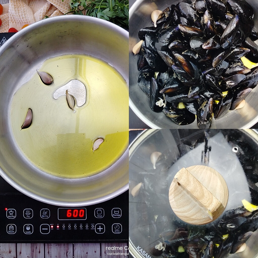 In a large pan, sauté half of the garlic in the oil. You can choose to use it peeled, minced, or whole. Add the mussels and cover with a lid. Over low heat, allow the mussels to open, releasing their cooking liquid. It will take 10-15 minutes.