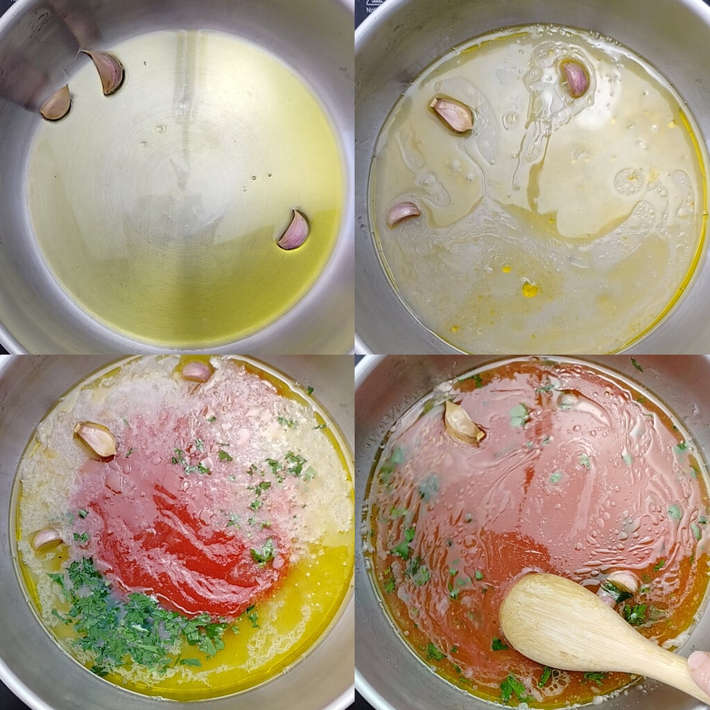 In another pan, again sauté the remaining garlic in the oil, add the strained mussel juice, freshly chopped parsley, and tomato sauce. Mix well and, if necessary, adjust the salt.