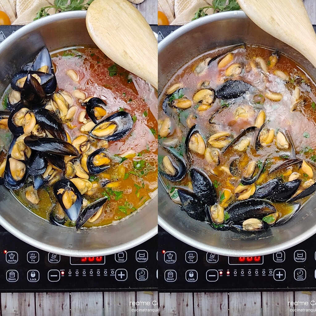 Add the previously cleaned mussels, stir again with a spoon, and cook for another 10 minutes over low heat, stirring occasionally. It will not be necessary to cover them with the lid again, as the sauce should thicken slightly.