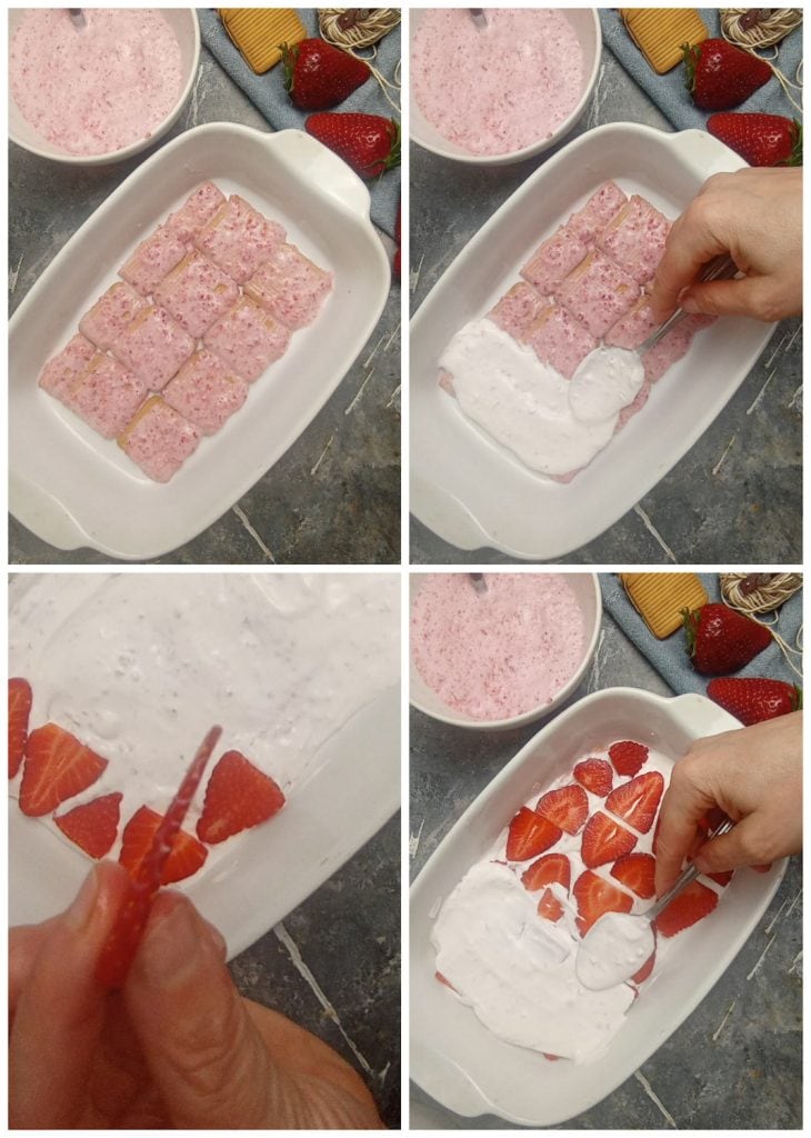 In a baking dish, make a base of cookies softened in the strawberry-milk blend.