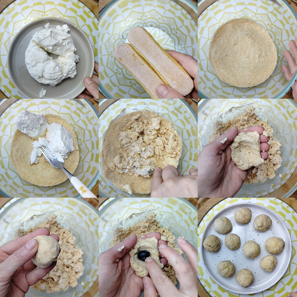 Truffles with ricotta and ladyfingers, with a truly fresh and delicious blueberry center.