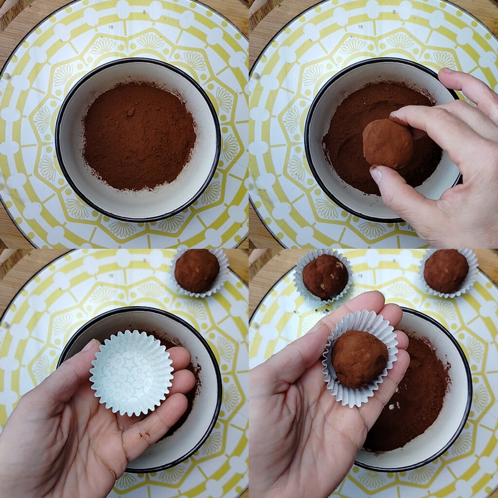 Prepare the cocoa powder and roll the truffles in it, making it adhere well.