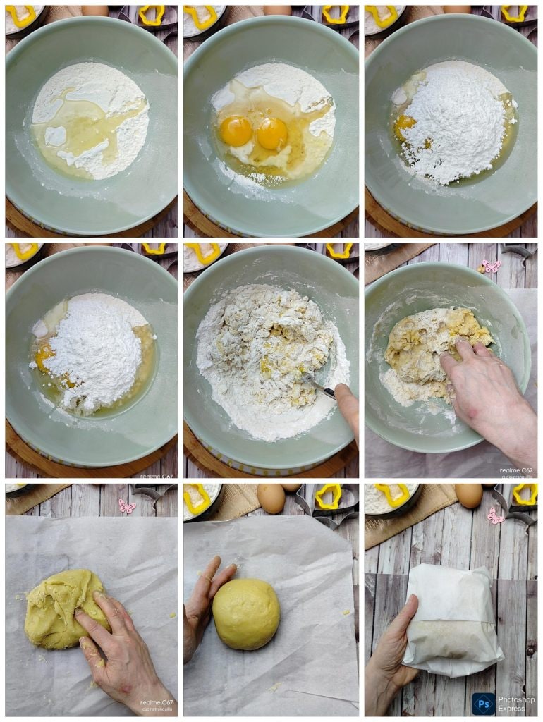 Work the ingredients rather quickly until you get a smooth and homogeneous dough that once ready, you will wrap in parchment paper or plastic wrap.