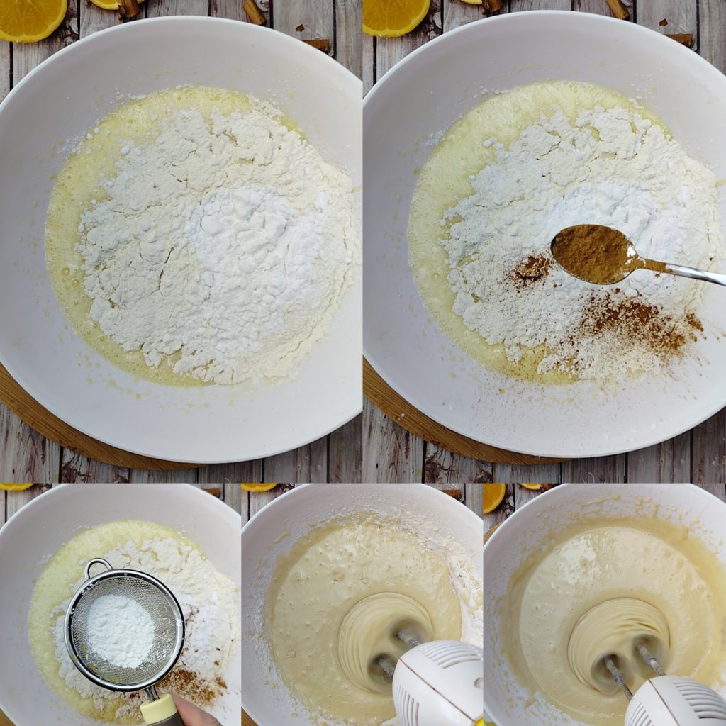 Add the flour, ground cinnamon, and sifted baking powder with a sieve and mix the ingredients well until you obtain a smooth and homogeneous mixture. You can use a spatula to incorporate the ingredients well with each other to prevent the powders from remaining at the bottom of the bowl.