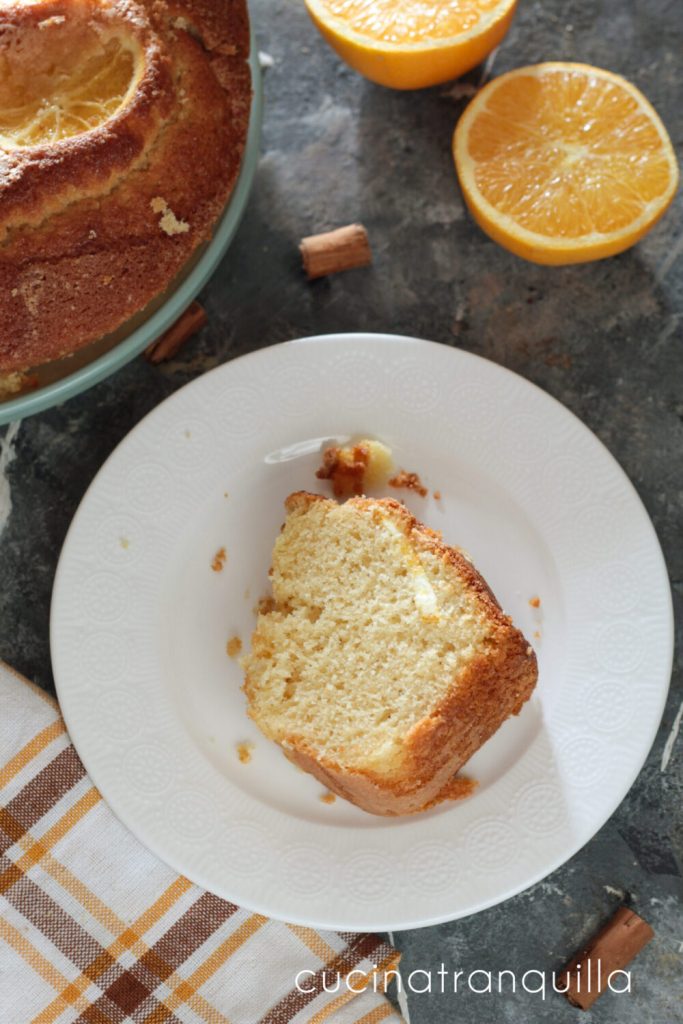 Check the cooking with a toothpick. If once pierced, it comes out dry, the cake is ready. Let it cool slightly before removing it from the pan. The Orange Pan Cake will remain soft and tasty for up to 5-6 days from its preparation. Just store it in a place protected from drafts and heat, preferably covered.