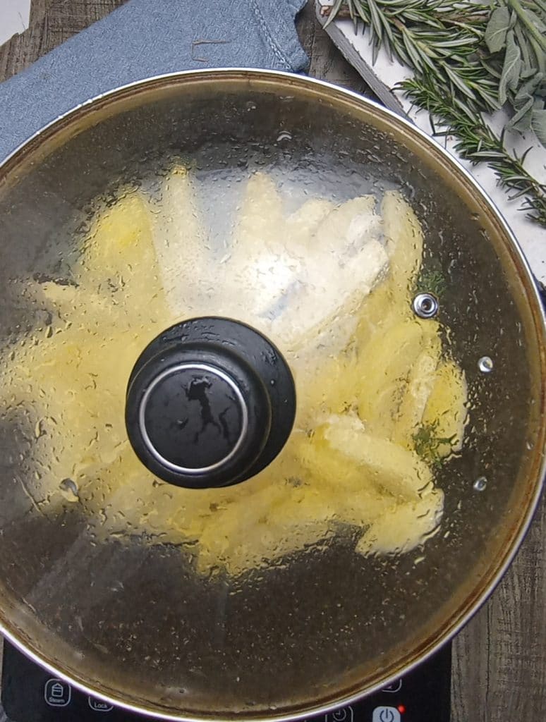 Then remove the lid and cook for another 5 minutes, taking care not to let the potatoes stick to the bottom of the pan.