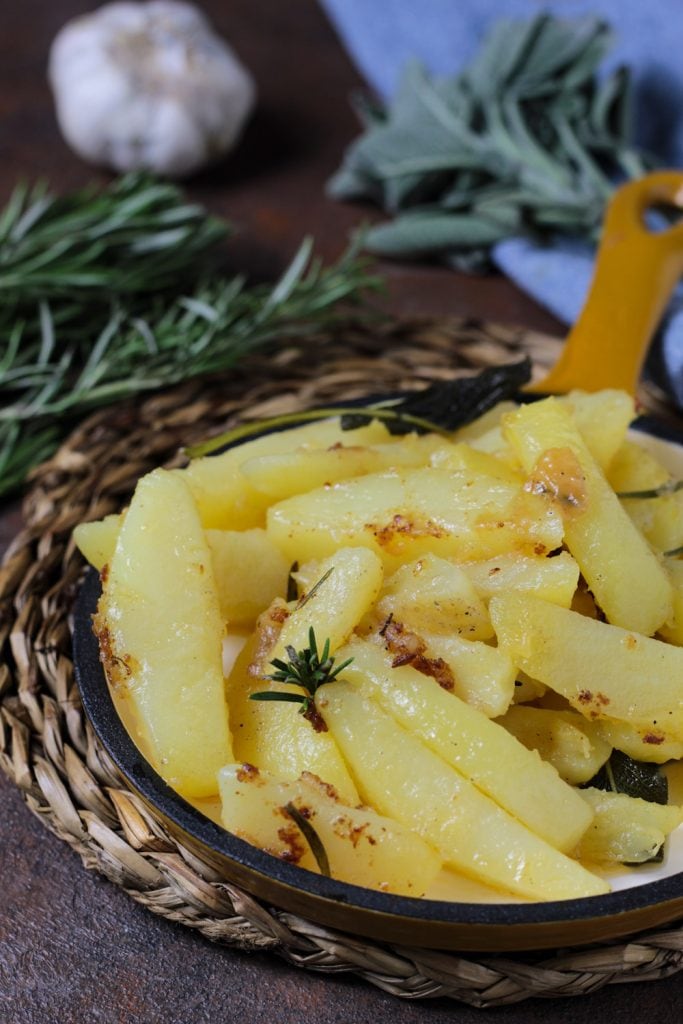 Pan-fried potatoes with butter and bay leaf and rosemary, an easy and delicious side dish, ideal to accompany many meat dishes.