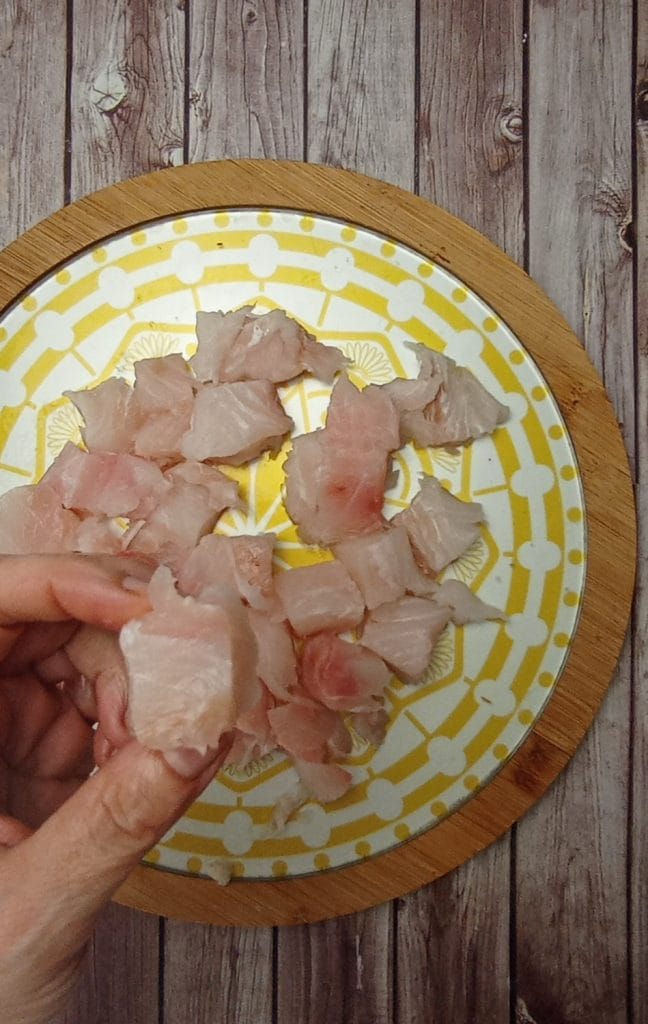 Wash the potatoes very well and also cut them into small cubes to allow even cooking with the fish.