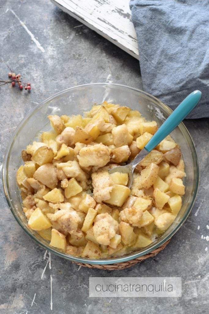 Pour the white wine; if you prefer, you can add another tablespoon of extra virgin olive oil and mix the ingredients well, stirring gently with a spoon.