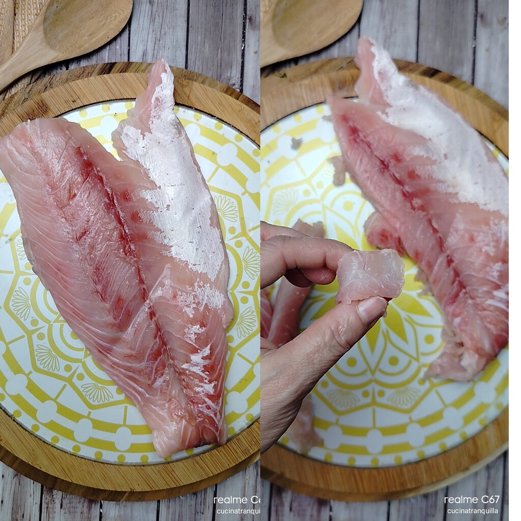 To make the Perch Bites in an air fryer, first dry the fish well with paper towels and, on a cutting board, cut it first lengthwise and then obtain similar-sized cubes from each strip.