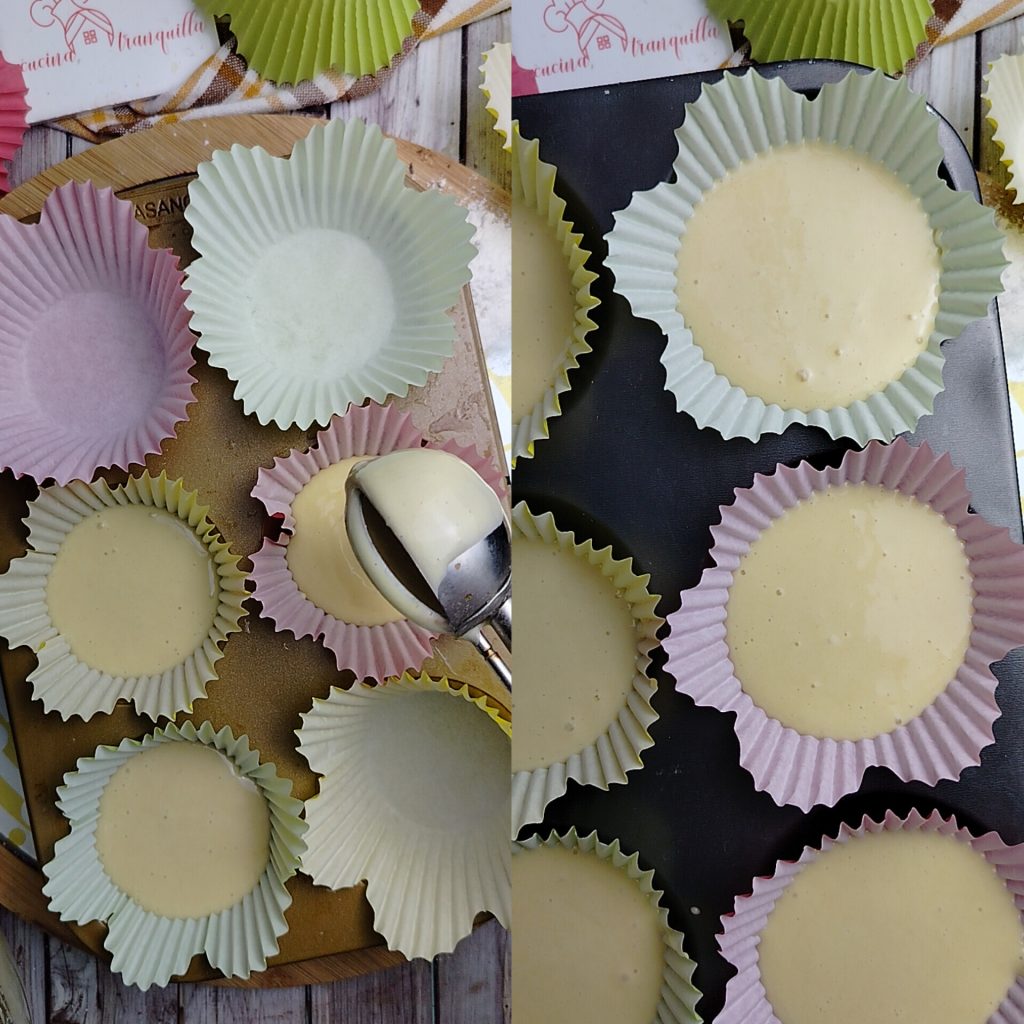 Spoon the batter into the muffin tin lined with paper liners, using a spoon or an ice cream scoop. Fill each cup two-thirds full. Bake in a preheated fan (convection) oven at 356°F for 30 minutes or until fully cooked in the middle. Remove from the oven and let cool.