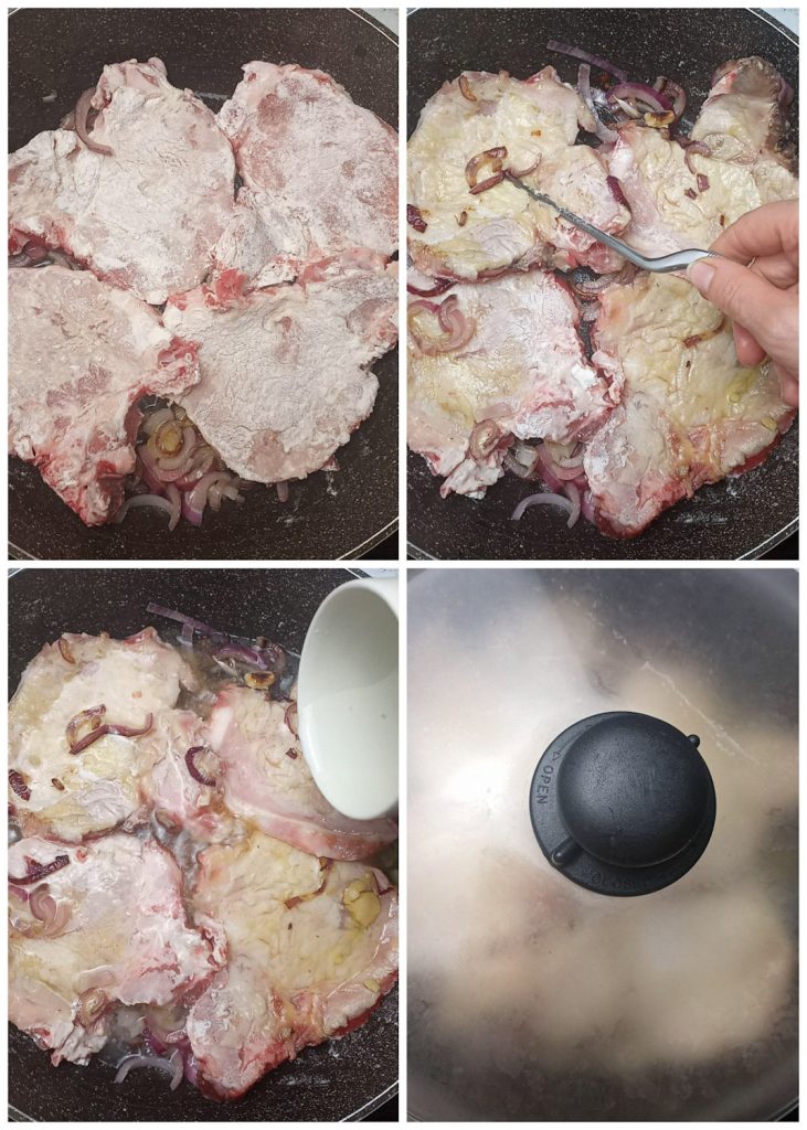 Meanwhile, coat the pork steaks in the flour and place them in the pan.