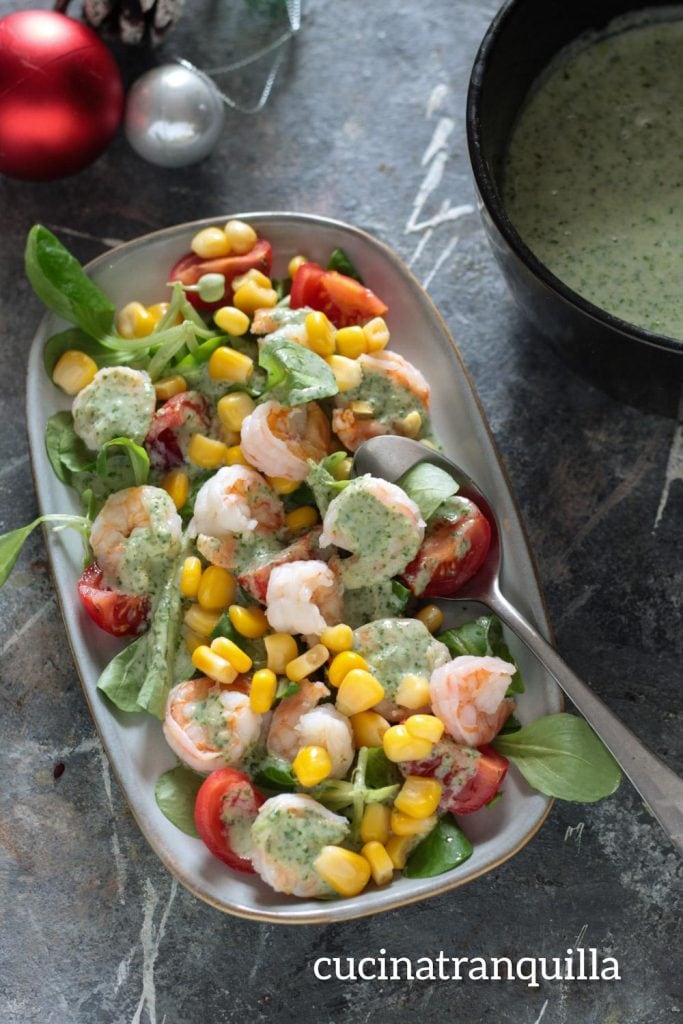 • Once the sauce is ready, put the lamb’s lettuce, washed and cut cherry tomatoes, prawns, and drained corn on a plate.