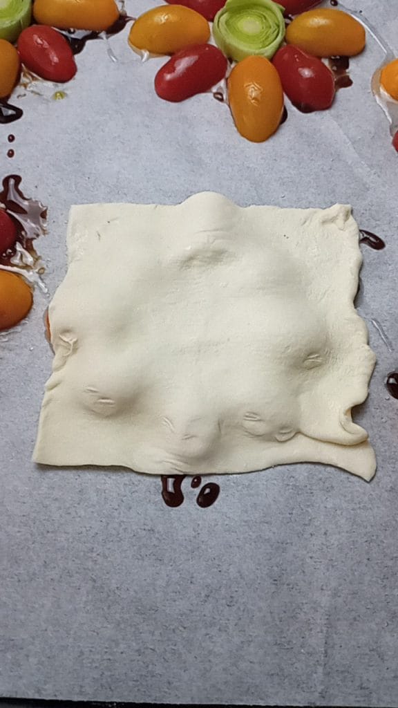 Cover each group of cherry tomatoes with a puff pastry rectangle.