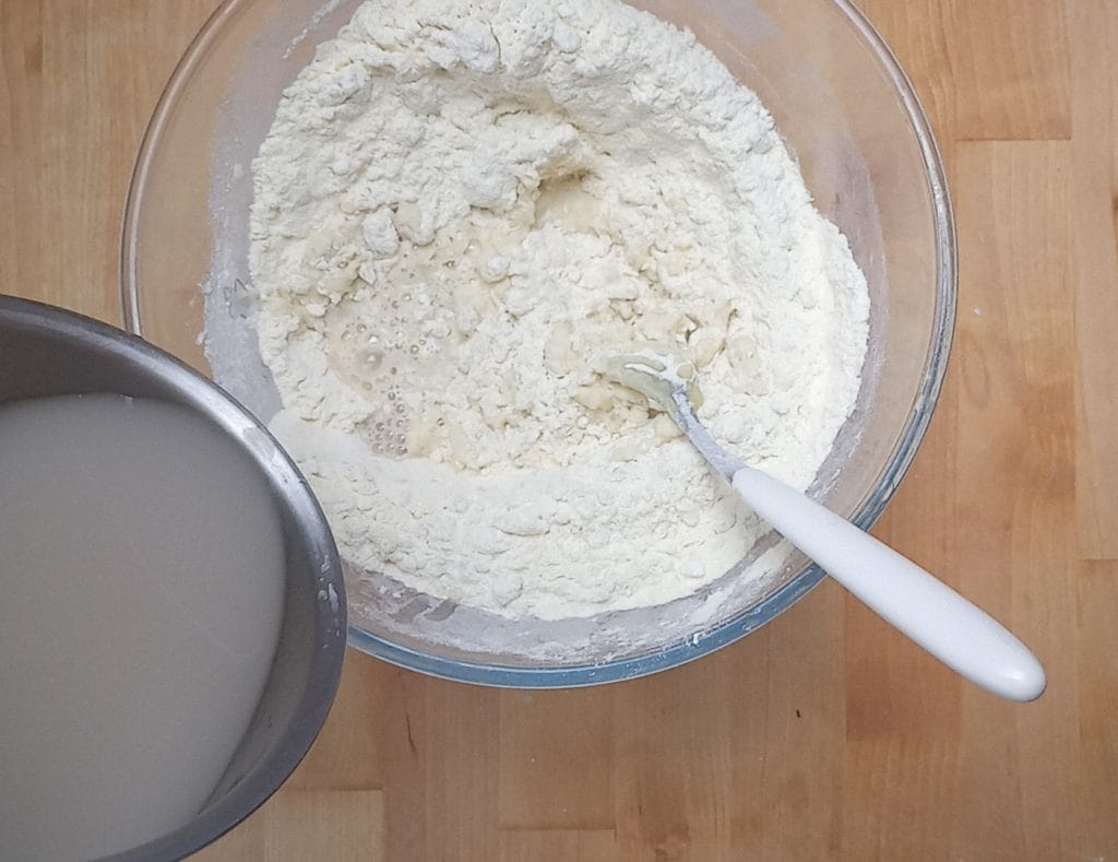 In a bowl, mix with a fork the flours starting from 250 g of semolina flour and 250 g of all-purpose flour.