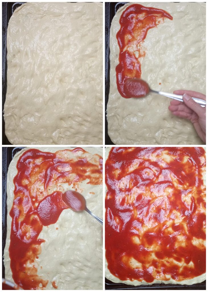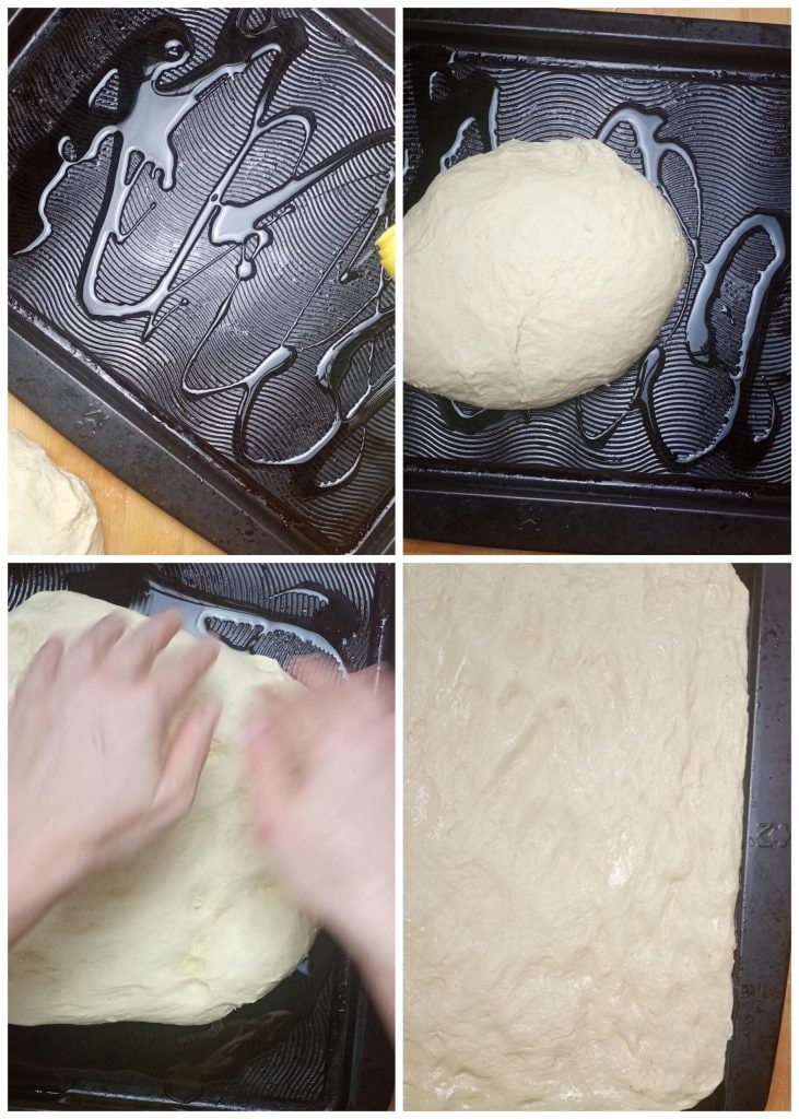 Grease the pan with a little sunflower oil and spread the dough from the center to the edges.