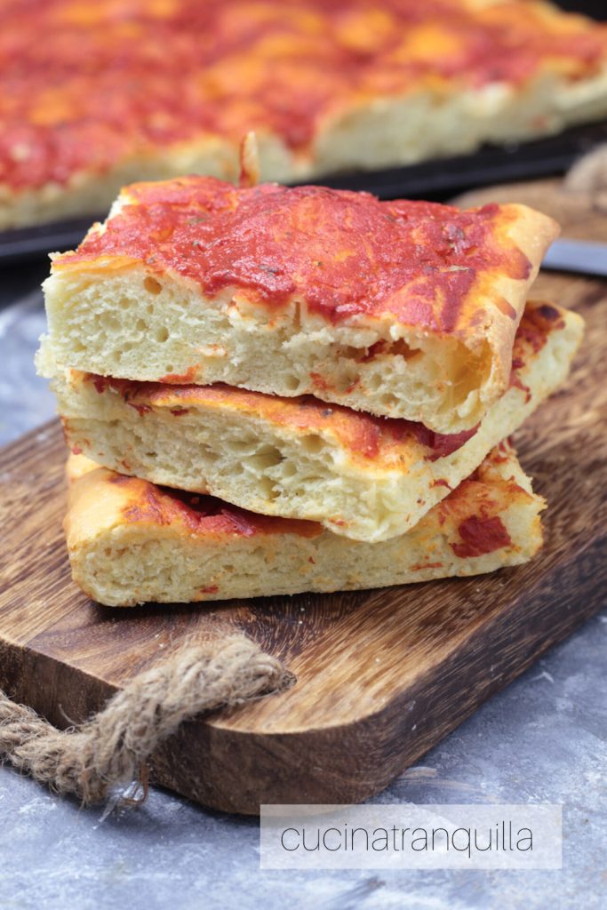 Red pan pizza with semolina flour, a perfect snack for both adults and children, great to take to school, ideal for eating at home.