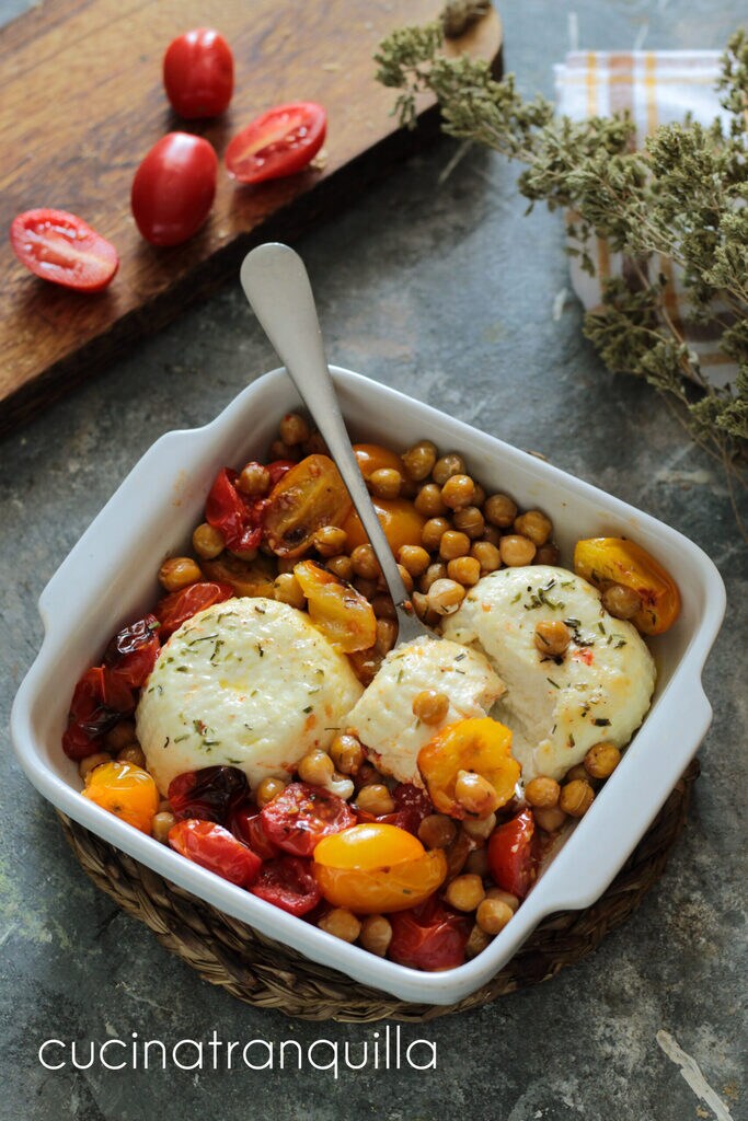 Add the cherry tomatoes, chickpeas, oil, salt, and chives, letting them also fall on the ricottas and mix the seasoning well.