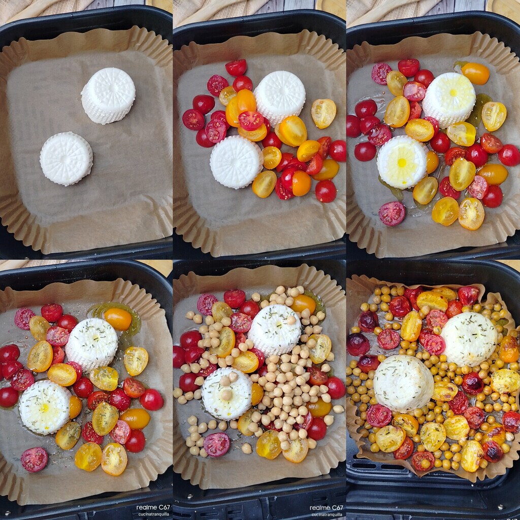 To make Ricotta and Chickpeas in the air fryer, first wash the cherry tomatoes well and cut them in half after drying them.