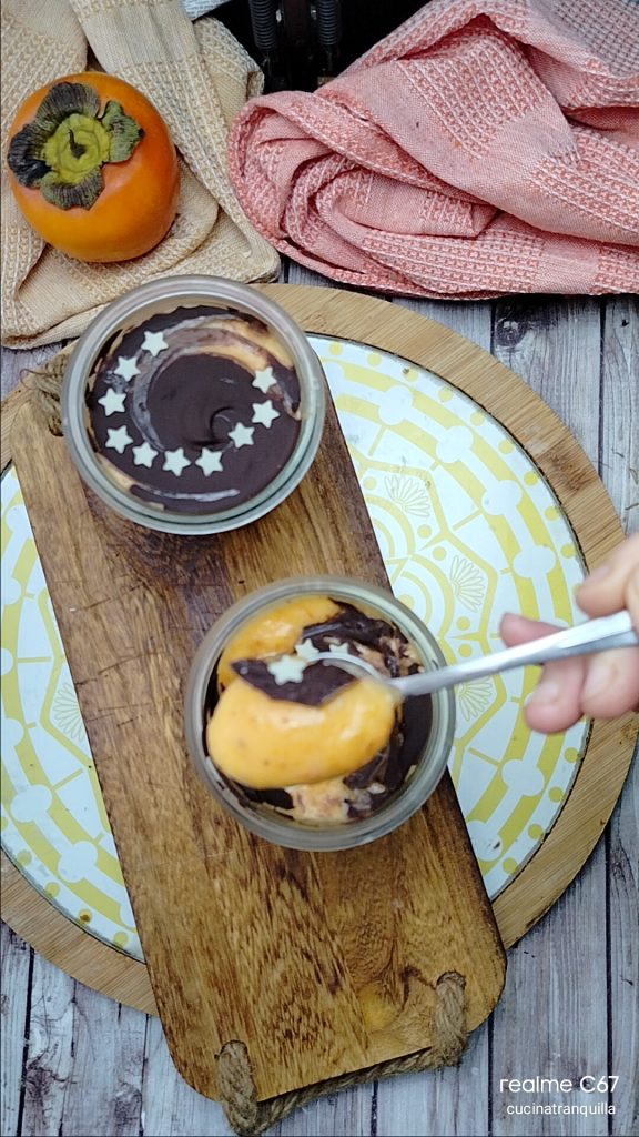 Ricotta and persimmon cream glazed with dark chocolate, an easy and delicious dessert, practically no-bake except for melting the dark chocolate. Also ideal for enriching the holiday table! It can be easily prepared in advance and poured into smaller glasses to create many cute little desserts to present. Beautiful sugar stars will make the atmosphere even more festive. The protagonist of this recipe is persimmons, a fruit rich in vitamins, with laxative and diuretic properties, originally from Japan and China, which arrived in Italy in the early 1900s. There are different types of fruit, such as persimmon apple and vanilla persimmon, perfect for this recipe. Below I leave you some ideas to use this fruit in multiple versions while further down I answer the most frequently asked questions about this type of recipe.