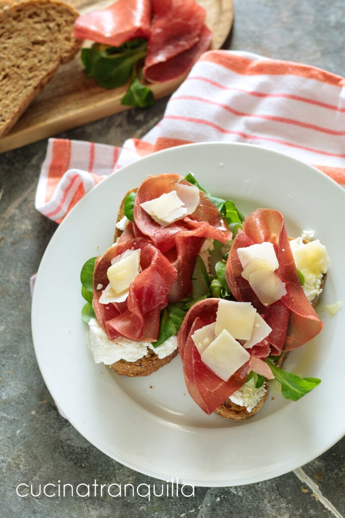 Ricotta Bruschetta with Bresaola and Parmesan, a fresh and light recipe with rye bread toasted on the grill or in the oven and topped with fresh and tasty ingredients.