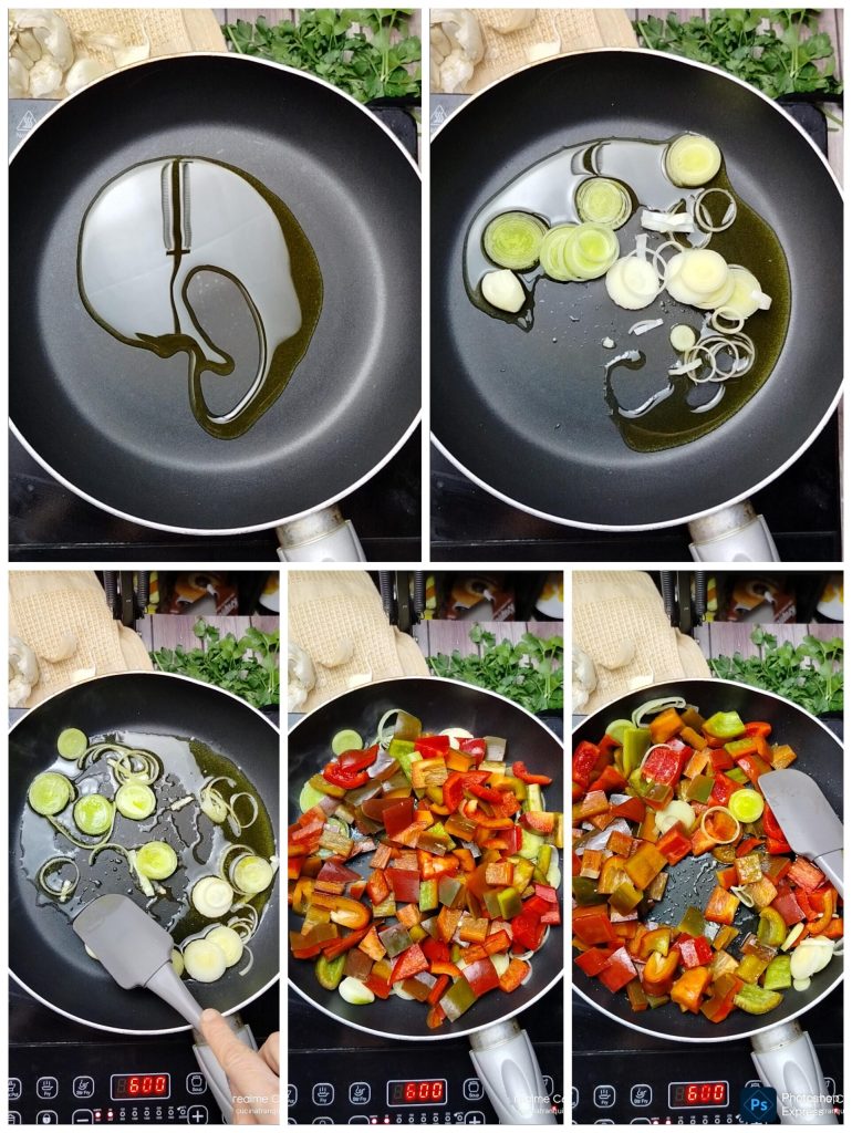 Rigatoni with bell pepper and leek cream, an easy dish to make with very few ingredients.