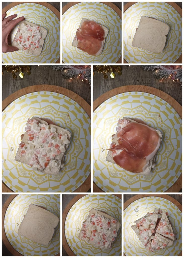 • Proceed as with the previous sandwiches, alternating layers of Russian salad with prosciutto and dividing the square into 4 triangles.