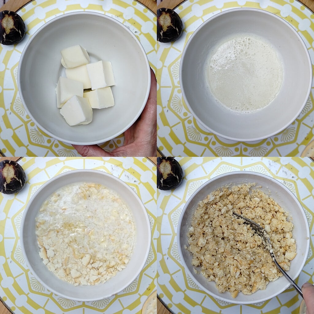 Melt the butter previously cut into cubes in a small bowl, in the microwave, for 30 seconds, at 50w power. Pour it over the crushed crackers and mix with a fork until well absorbed.