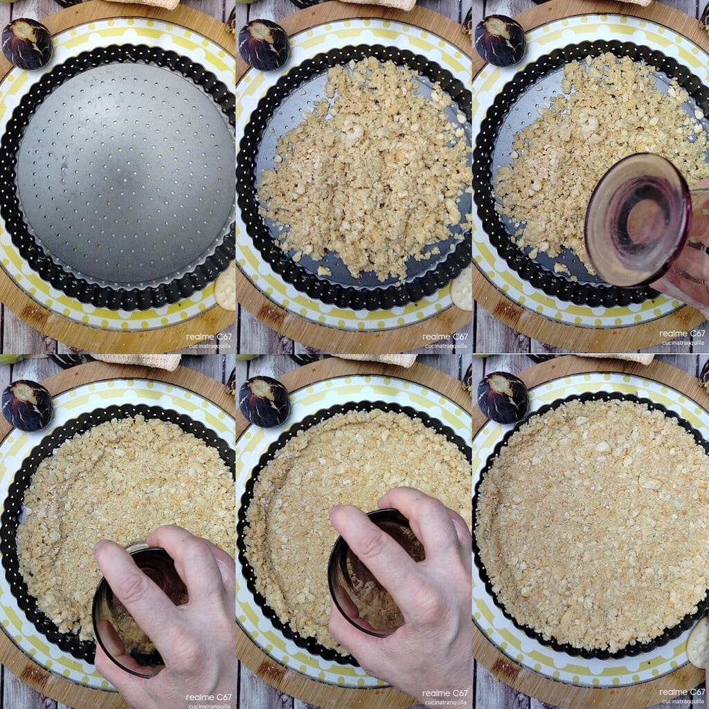 Pour the base into the removable bottom mold and, with the help of a glass, press it to make it more compact, being careful to create the edges. Let rest in the refrigerator for about 30 minutes or a little more.