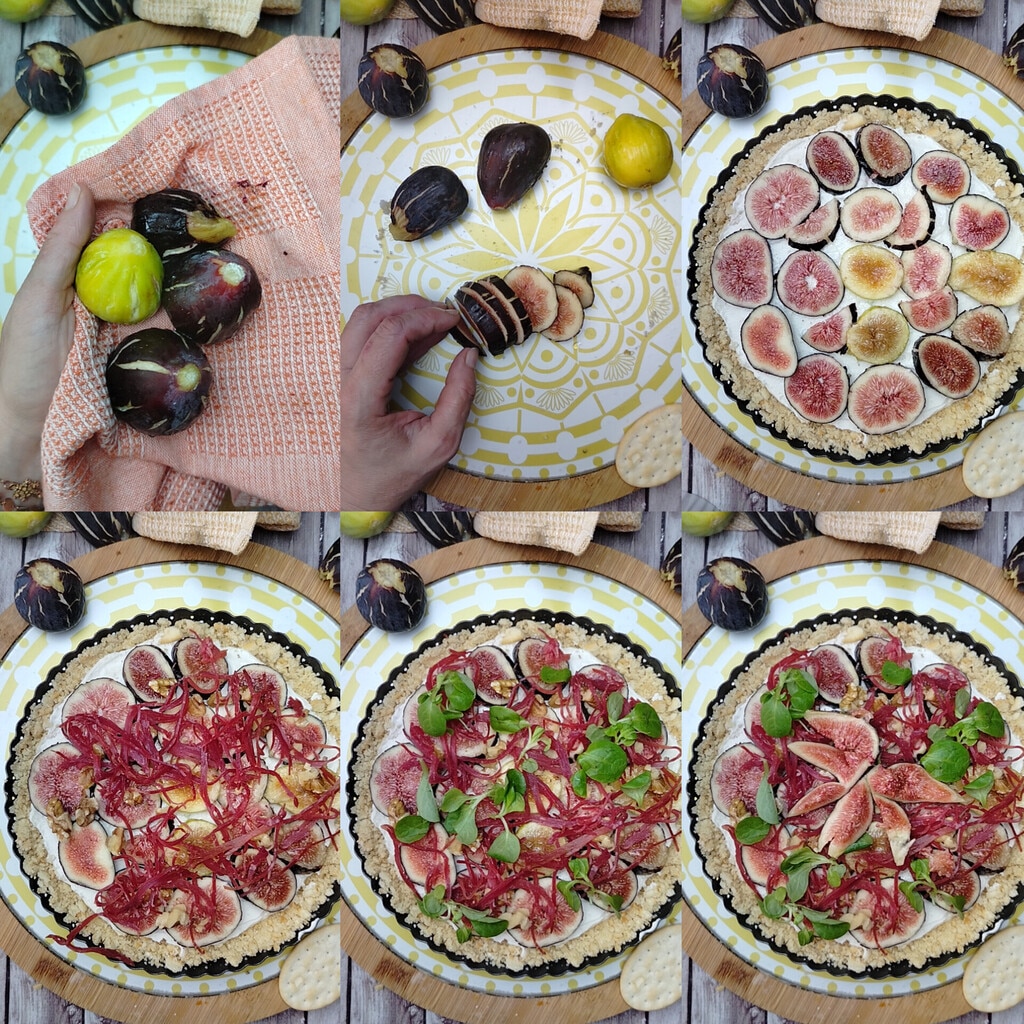 Savory cheesecake with fresh figs, no-bake except for the butter for about 30 seconds, and gelatin-free, an easy and delicious recipe perfect for completing your late summer table. Ideal to make with not too ripe figs, this cheesecake is made with very few steps and is also ideal as an appetizer. To make the base, you can use any type of crackers you prefer in the quantity I have described. I personally opted for water-based crackers for a lighter recipe, but seed crackers will also be perfect for that extra touch. My recipe is further refined and unique due to the choice of some ingredients that you may omit or substitute, as I suggest in the answers to your most common questions at the end of the recipe. Indeed, I chose to garnish my cheesecake with bresaola fillets and lamb’s lettuce, making it even more appetizing. Among the tools, I opted for a mold with a removable bottom. This makes it easier to cut the cheesecake when serving it at the table.