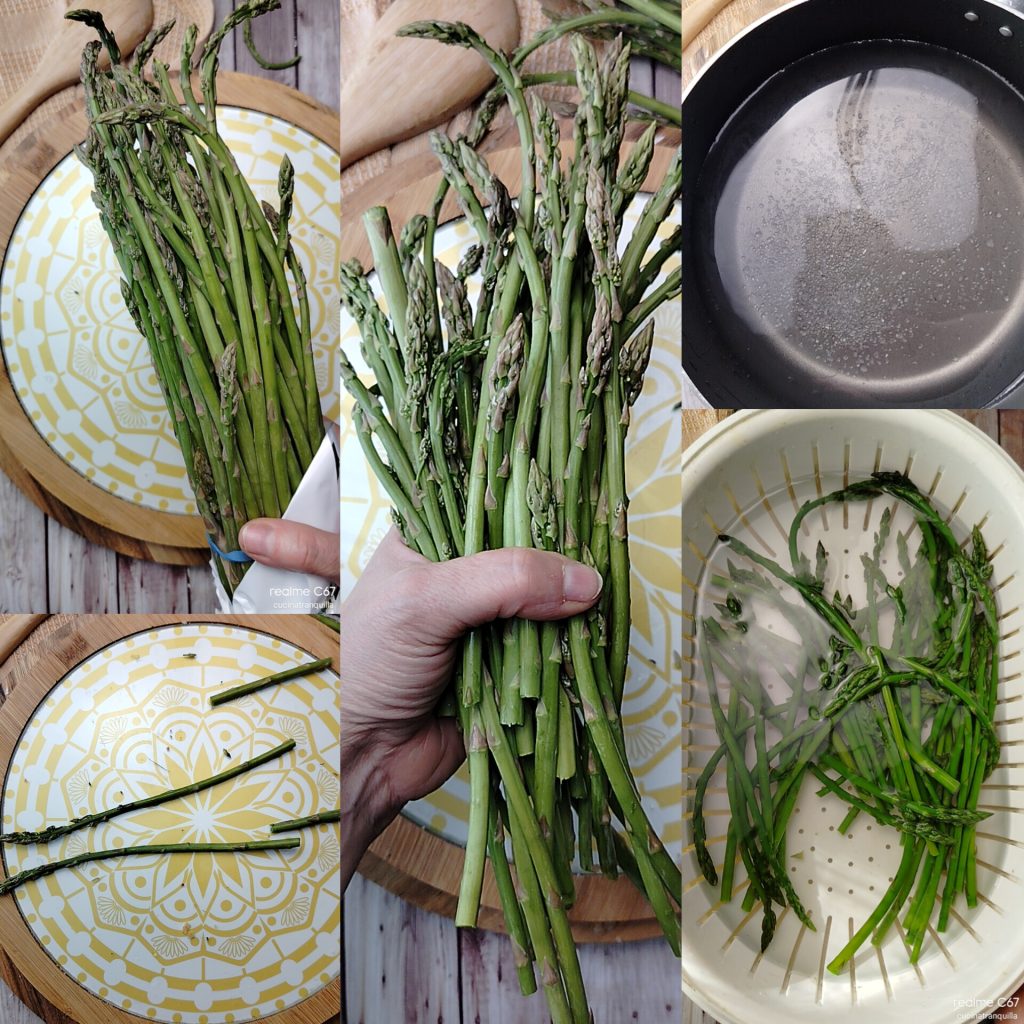 To make the Savory Pie without Flour with Asparagus and Cooked Ham, first clean the asparagus by removing the tough base of the stalk.