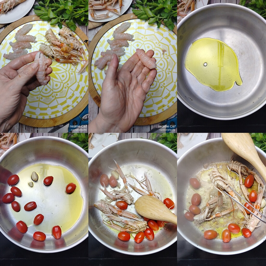 To prepare Spaghetti with Langoustines and Cherry Tomatoes, first clean the langoustines well. Separate the heads from the bodies and set them aside, cut the shell open gently. Also set aside a few whole langoustines.