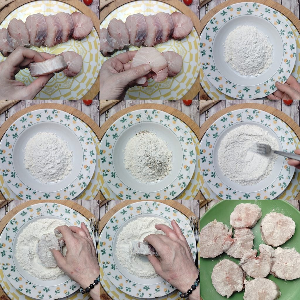 On a plate, place the flour, salt, and pepper and coat the dogfish ensuring the breading adheres on all sides.