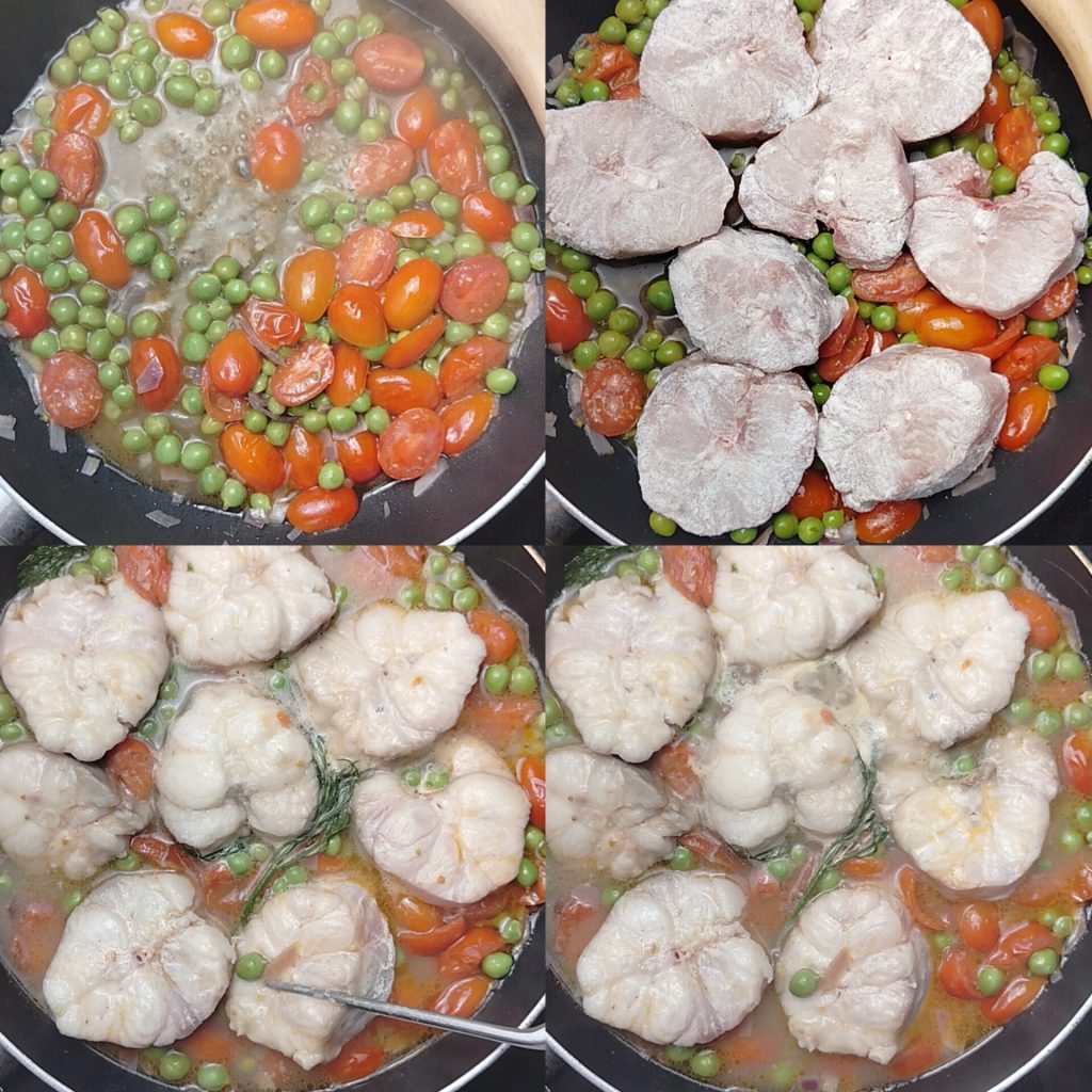 Dogfish spring with peas and cherry tomatoes, a simple dish made with fresh ingredients but adaptable to any season.