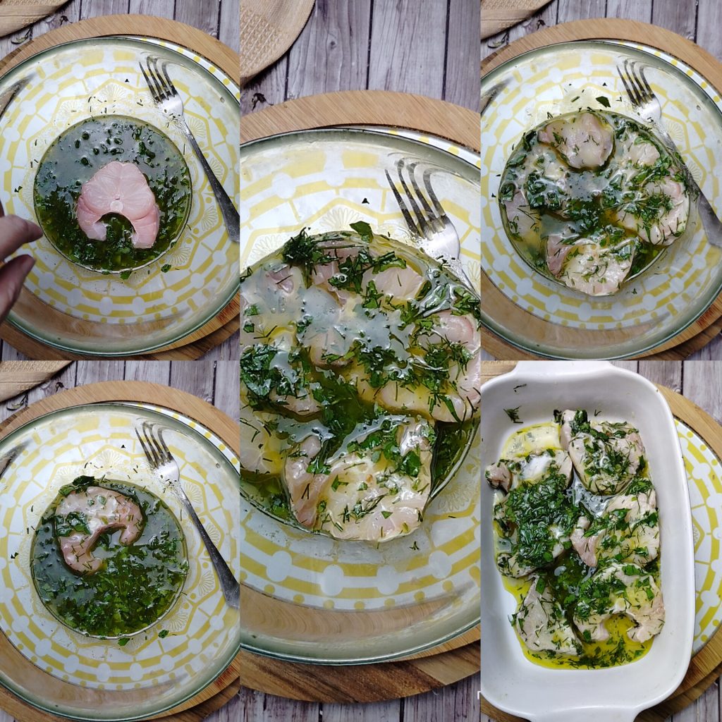 Immerse the palombo, cut into slices about 3/4 inch thick, letting the fish absorb the flavors on both sides. Cover with plastic wrap and let marinate in the refrigerator for 30 minutes. After this time, transfer everything from the bowl into a baking dish.