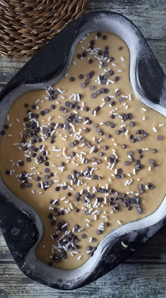 To taste we can decorate the surface with granulated sugar and dark chocolate chips. A great idea would also be to use the chocolate from Easter eggs.