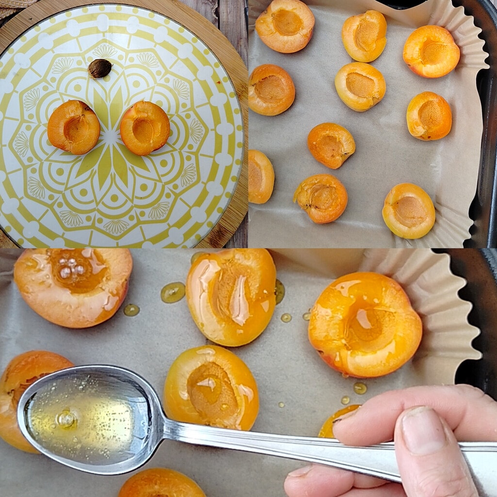 • To make the Tasty Caramelized Apricots in the Air Fryer with Gorgonzola and Mascarpone, first wash the apricots well, then dry them with a clean cloth. Cut them in half along the pit and remove it. Place the cut apricots in the air fryer basket lined with its parchment paper and distribute the chosen honey over each piece. Cook at 338°F for 7 minutes.