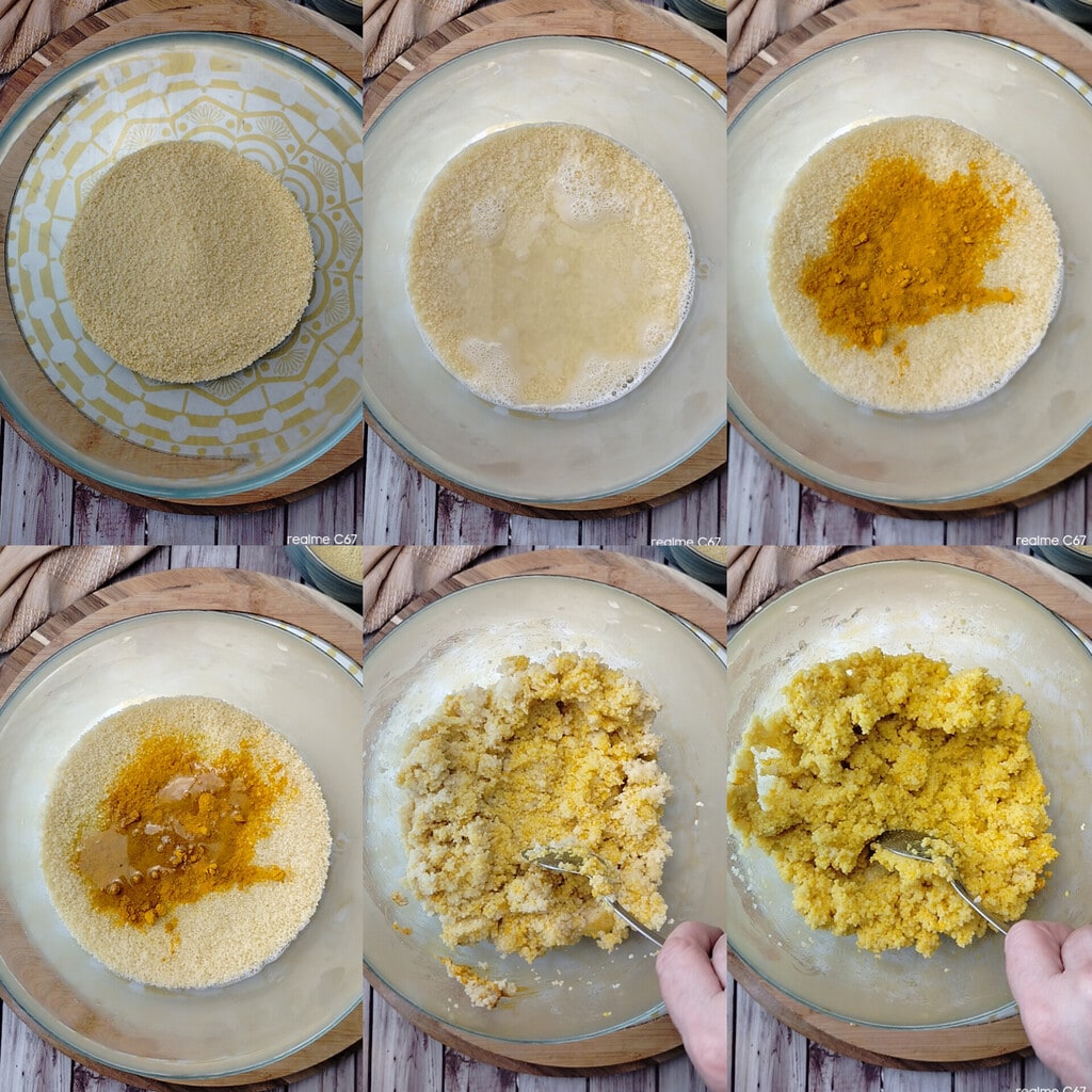 Add the turmeric, the salt, and a tablespoon of oil, and gradually fluff the couscous.